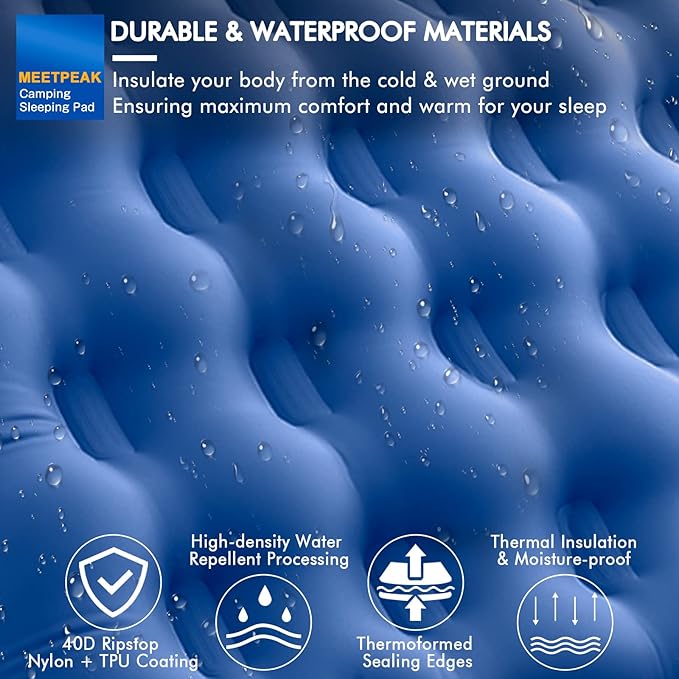 - ⛺UNIQUE INTERIOR STRUCTURE & EVERLASTING DURABILITY - Built for the outdoor activities, the sleeping pad made of durable & outdoor grade materials-40d nylon. Thermoform sealing and TPU coating make the camping pad 100% waterproof and warm which will protect you from the wet ground in the most extreme conditions. With the special internal multi-point column support and honeycomb-column air cell design, not only improve the bearing capacity but also ensure the elasticity of the mattress while not deformation. Look, prefect sleeping mat, start a nice outdoor sleeping experience.