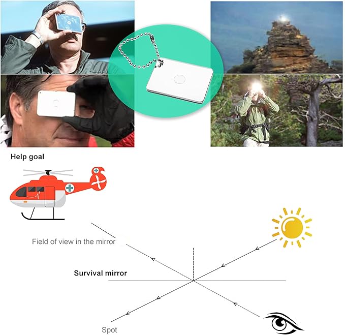 - OUTDOOR SURVIVAL KIT ⭆ The signal mirrors are perfect for long-distance communication out in the field. It is a useful tool in emergencies during outdoor activities. The whistle and the lanyard included have bright and reflective colors for high visibility. The lanyard can be worn or attached to a camping bag or backpack.