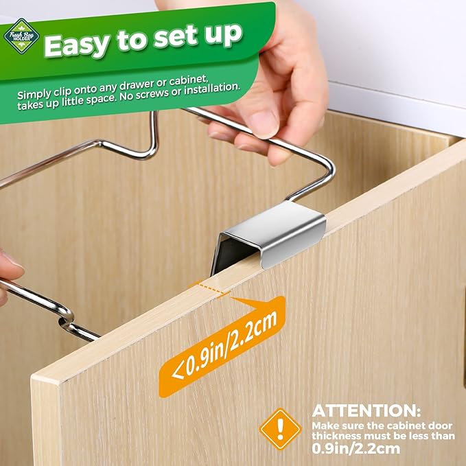- EASY TO SET UP No drilling and installation required, just hang it on your kitchen cabinet door or drawer. It will not damage your furniture. The bag holder also features a padded backing to protect the cabinets and drawers from scratches.