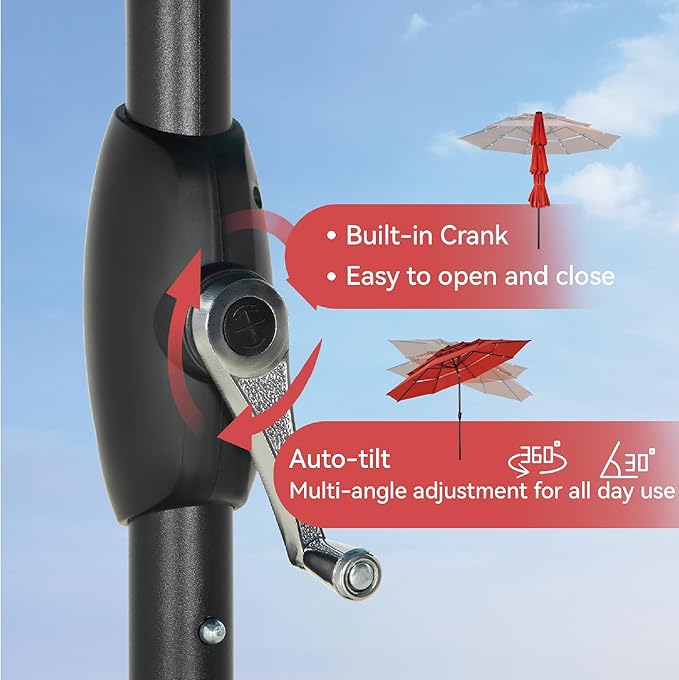 - 【Convenient Crank & Tilt System Table Umbrella】This outdoor umbrella is designed with crank open system for easy and quick use,The Auto tilt for all day use,for more angles of shading, keeping away from the hot sunlight. Ideal for both residential and commercial locations