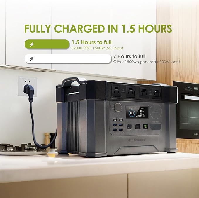 - 【Clean and Green Power Source】: It is recommended to use green solar energy (1000W max) to charge it for your outdoor adventure. Package Included: Unprecedented 5-YEAR product warranty, ALLPOWERS S2000 Pro portable power station, AC charger cable, Waterproof bag, user guide, warranty card.