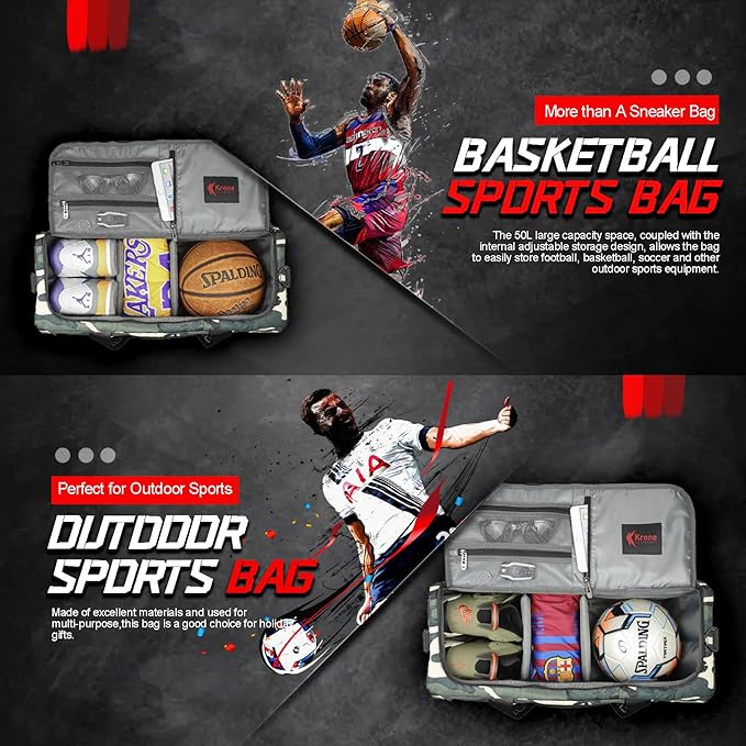 • WIDE USAGE: This fashion travel duffle bag is not only used as a shoe suitcase for travel. Adjusting the 3 dividers inside, the bag can be customized to fit any storage needs. It is perfect for traveling, outdoor activities, baseball, football, basketball, and clothing storage. This large travel duffle bag can be transformed into a Sneaker Bag / Travel Duffel Bag / Gym Bag / Sports Bag / Boxing Bag / Athletic Bag.