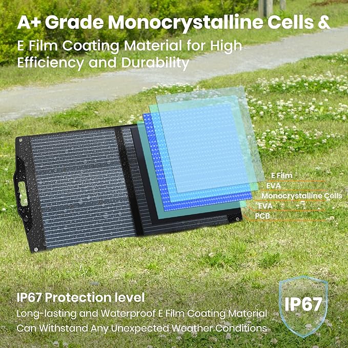 - 【24% High-Efficiency Conversion & Rugged Durability】 Advanced monocrystalline cells achieve 24% solar conversion efficiency, protected by IP67-rated waterproofing (excluding junction box) and anti-aging ETFE coating to withstand harsh environments.