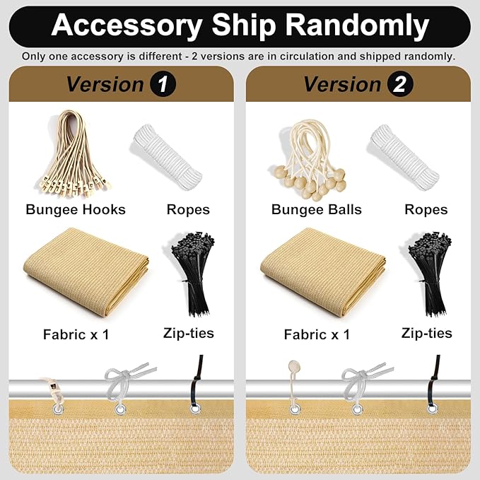 - Accessory Updated: Accessories have been updated from [Zip-ties, Ropes, Bungee Balls] to [Zip-ties, Ropes, Bungee Hooks]. Both versions are in circulation and will be shipped randomly. Versatile Use: Perfect for outdoor spaces like patios, lawns, gardens, and pergolas. Additionally, it serves as an effective privacy screen, windbreak, plant cover, and finds applications in greenhouses, coops, kennels.