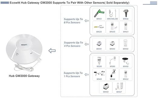 - 【Support Various Ecowitt Weather Sensors】: GW2000 Wi-Fi hub/gateway can collect sensor data from various Ecowitt wireless sensors(sold separately), such as WS90 intergreted outdoor sensor, WH32 outdoor temperature and humidity sensor, WH40 rain gauge sensor, WS68 wireless anemometer, up to 8 WH31 multi-channel temperature and humidity sensors, up to 8 WH51 soil moisture sensors, up to 4 WH41/WH43/ WH45 air quality sensor, WH55 Water leak sensors and WH57 Lightning sensor.