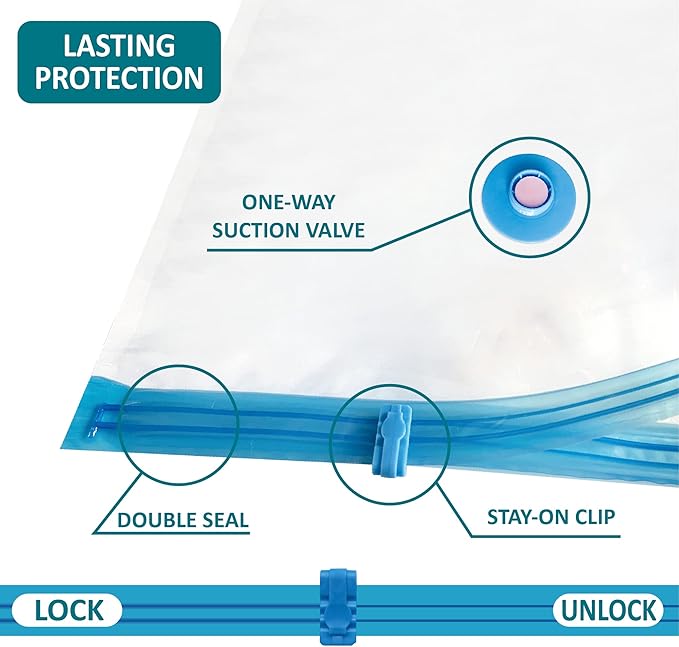 - Durable protection: With the triple-seal turbo valve & double-zip seal design, our vacuum bags get the air out in the suction process. Can be used repeatedly.