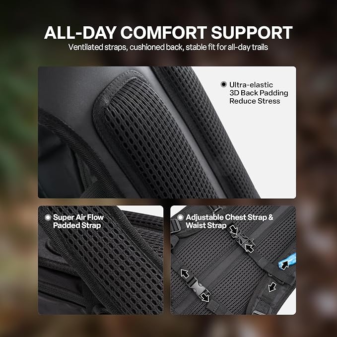 - HIKING/CYCLING/RUNNING/SKIING WITH EASE: This 2 lbs lightweight water backpack features an ultra-elastic 3D breathable padded back, adjustable chest and waist straps to provide comfort and stability for all body sizes. This day pack has got you covered for all your adventures.