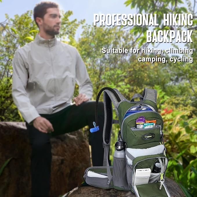 - 【Insulated Bladder Compartment】: Hiking backpack with water bladder with the special thermal insulated bladder compartment, hydration packs keep your liquids cool for up to 5 hours to guarantee that you can freely drink ice water