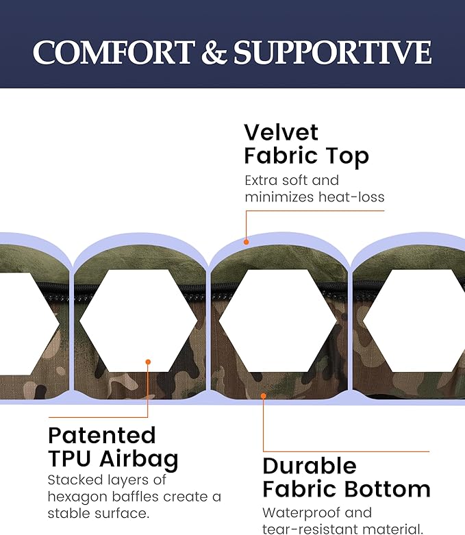 - PATENTED HEXAGONAL SUPPORT: The patented hexagonal airbag design creates a stable surface, offering unmatched comfort whether you sleep on your back, side, or stomach. It allows you to freely adjust your body balance and comfort. With 4.75 inches of extra thickness, it keeps your body elevated from the ground, providing insulation from the cold and ensuring a restful night’s sleep