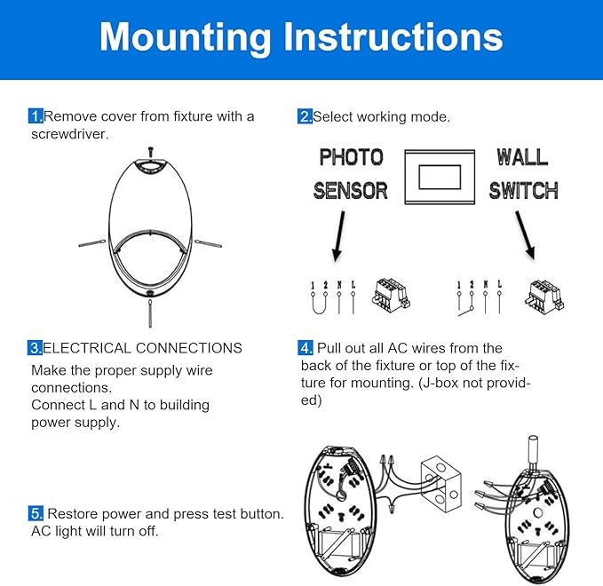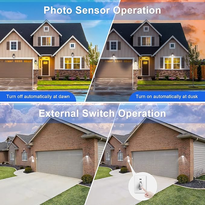 - 🌞【Photocell & Wall Switch Operation】--When the power supply system is powered off, the lamp will start the emergency system to turn on the light, and the duration can be up to 90 minutes. The lamp has a light-sensing recognition function. When the light is The 3FC light turns off automatically.Or can be switched through an external switch (not include).