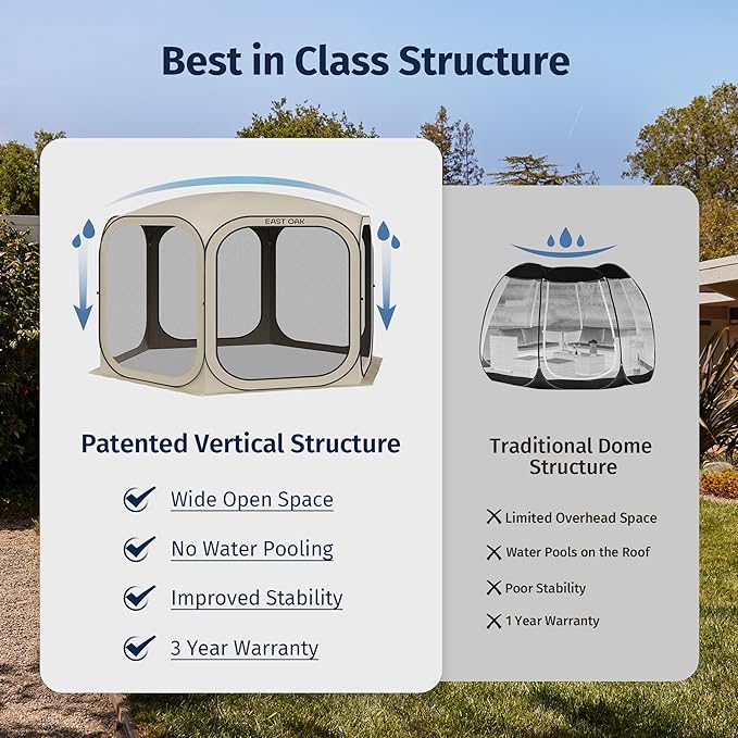 - ๐๐๐ด-๐ฃ๐ฟ๐ผ๐ผ๐ณ & ๐ฉ๐ฒ๐ป๐๐ถ๐น๐ฎ๐๐ฒ๐ฑ: The EAST OAK portable pop-up screen teent features a 4-sided B3 fine mesh design for 360ยฐ perfect ventilation to protect you from mosquitoes, bugs and anything the outdoors can throw at you. The tent body is made of high-quality Oxford fabric with anti-UV silver coating to achieve all-day UPF 50+ UV protection. Perfec for picnics, camping, and the beach