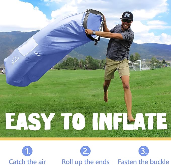 - Easy Inflation Design -- No pump required for AlphaBeing air lounger. Just a few scoops of air and this inflatable lounger is ready to hangout in. This is a must-have for any BBQ, beach, hike, concert, or camping trip. Folding to 12"x 8"x 4"and fitting in its own carrying bag with shoulder strap, this air sofa is ready to be taken anywhere with you.