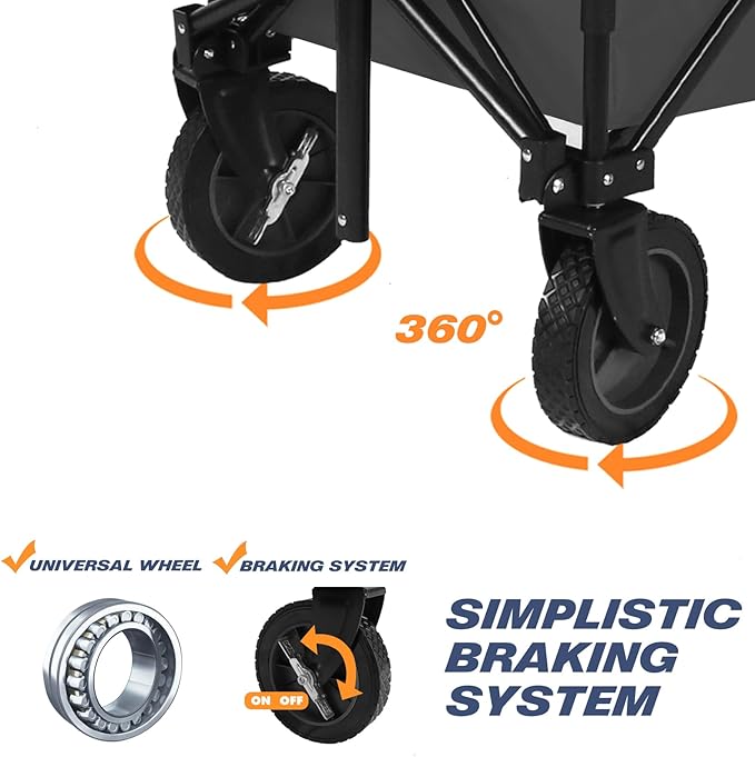 - Gimballed Wheels With Braking System:Designed with 360°rotating front wheels that make pushing over uneven ground a breeze. The front wheels also rotate which provides better steering and cornering, while the back wheels are fixed.The handle connects directly to the axle, giving you superior control.what's more we've added a built in braking system to keep the wagon securely by your side.