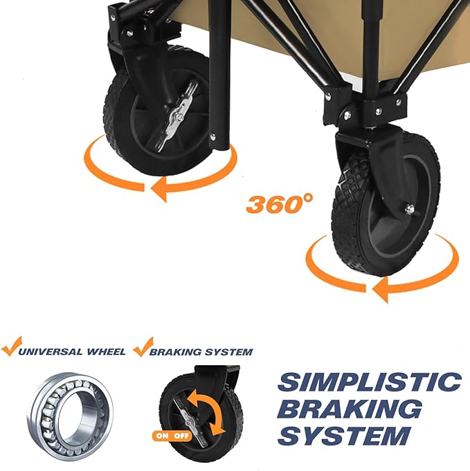 - Gimballed Wheels With Braking System:Designed with 360°rotating front wheels that make pushing over uneven ground a breeze. The front wheels also rotate which provides better steering and cornering, while the back wheels are fixed.The handle connects directly to the axle, giving you superior control.what's more we've added a built in braking system to keep the wagon securely by your side.