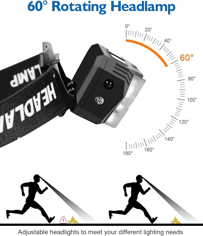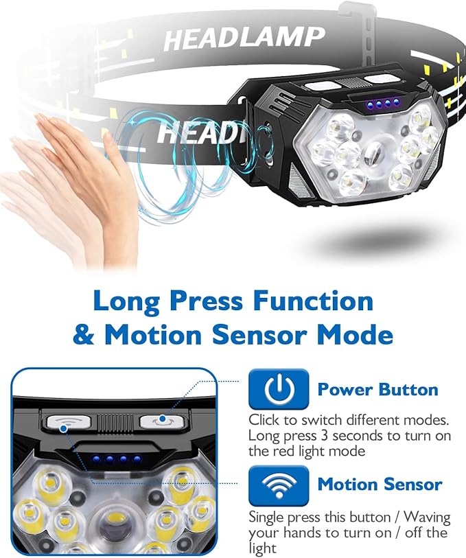 - 10 Modes and Motion Sensor: The head flashlight has 10 modes to meet all your needs.①Power Button-6 key modes, you can switch the main strong beam, main weak beam, side strong beam, all lights bright, red beam, red strobe.②Motion Sensor Button-4 motion sensor modes, you can easily turn the lights ON/OFF by waving your hand.