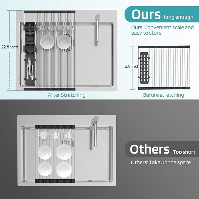 - 【FOLDABLE & ADJUSTABLE】The perfect design of this dish drying rack is really works great and also can be rolled up for storage . expand it to the right size When you use the sink dish drying rack.This dish drying rack drainer is convenience and efficiency of being able to roll it up and store it in the cupboardcan or drawer quickly when not in use.this over the sink dish strainer can extends your counter space, is ideal for washing produce, and easily rolls up out of the way.