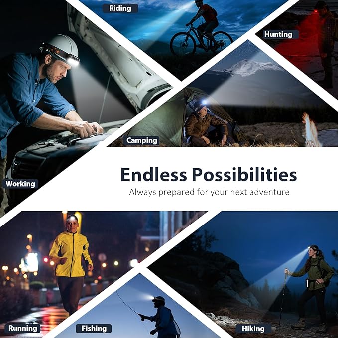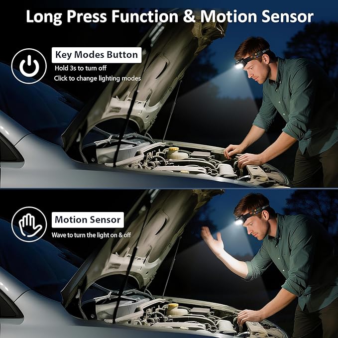 - Super Bright and Motion Sensor: The headlamp flashlight uses class-leading LED chips that has 2X brighter high lumens, easily light up an entire tent and road, even the mountain. It added motion sensor mode, you can easily turn the lights ON or OFF by waving your hand, which is more convenient and avoids soiling the headlamp when your hands are dirty