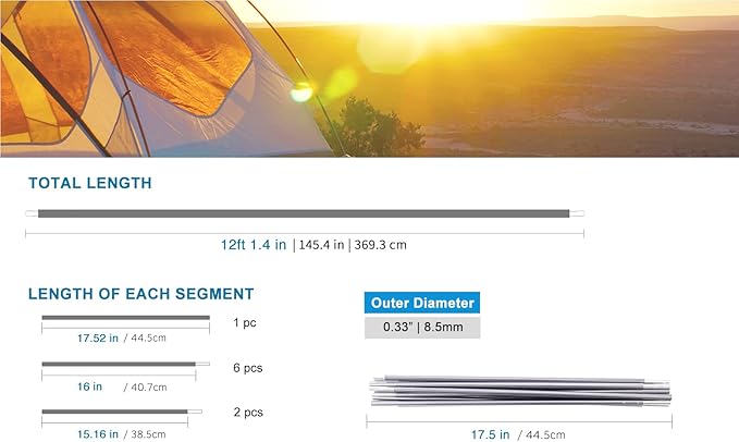 - NO MORE FIBERGLASS POLES - Fiberglass poles tend to crack and have devilish microscopic splinters which are difficult to remove. Replacing them with Aluminum poles before they deteriorate and fail at some inopportune moment can get a prolonged lifespan and eliminate the trouble of buying tent poles frequently.