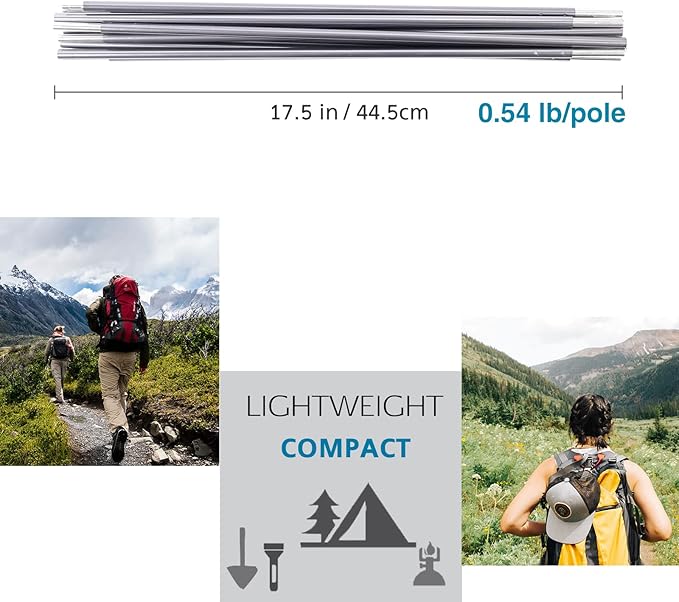 - COMPACT & LIGHTWEIGHT - One pole only weighs 0.54 lb, and measures 17.5” long after assembled. You can easily fit the poles inside your panniers or backpack. The shorter segment length and lighter weight mesh well with your motorcycle or backpacking camping needs.