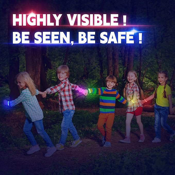 - 【Multi-Usages】:Nicely visible while walking, riding, running, or on a motorcycle at night. Secure enough that you don't have to worry about it flying off at higher rates of speed. Also perfect for dog collar when night walking. Great party supplies. Enough for you to share with your families and friends. Kids always love this light up bracelets. Age grading: 3 + years old