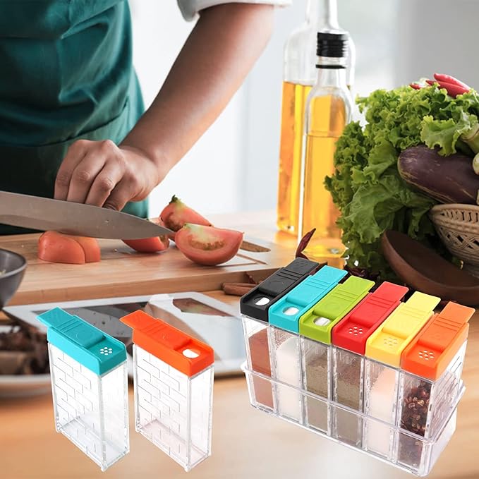 - 2-IN-1 Lid Design: The spices container set has a 2-in-1 lid, for pouring out granulated spices and herbs on one side and sprinkling powdered spices on the other. Just gently slide the lid to pour out the spices. The thoughtful opening is designed to meet your daily use needs without the need to change lids.