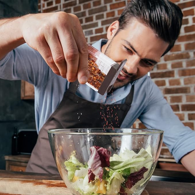 - 2-IN-1 Lid Design: The seasoning containers with labels have a 2-in-1 lid, for pouring out granulated spices and herbs on one side and sprinkling powdered spices on the other. Just gently slide the lid to pour out the spices. The thoughtful opening is designed to meet your daily use needs without the need to change lids.