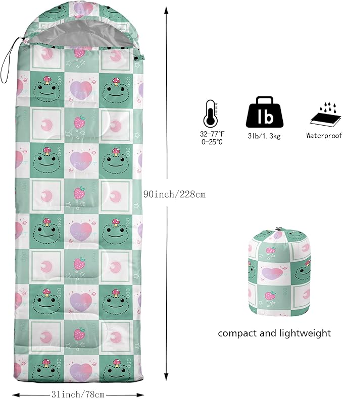 - FITS FOR 3 SEASONS: SIZE - 31 by 90 inches (W x D). Our sleeping bag can be used in 3 seasons with a design temperature of 32℉-77℉(0℃-25℃). These bags also have a weather resistant waterproof design to keep you warm and prevent you from any dampness.
