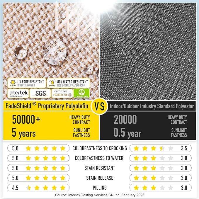 - 【FadeShield - UV Fade Resistant】FadeShield Proprietary Polyolefin are dependable indoor/outdoor performance fabrics, they can withstand 5 years of UV fade resistance, solution-dyed to make sure that each color is deeply ingrained in every fiber for continued vibrancy, even after heavy use. We recommend bringing it indoors when it rains or when not in use to preserve its lifespan and keep it looking beautiful.