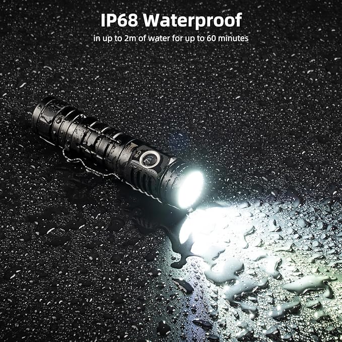 - TACTICAL FLASHLIGHT: WUBEN C2 is made of hard anodized aircraft grade 6061 T6 aircraft aluminum, which is resistant to high and low temperatures, IP68 waterproof and 1.5M impact resistance, which makes this tactical flashlight more rugged and durable, and it's perfect for all kinds of daily use, survival, outdoor camping and more.