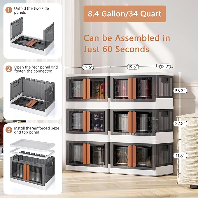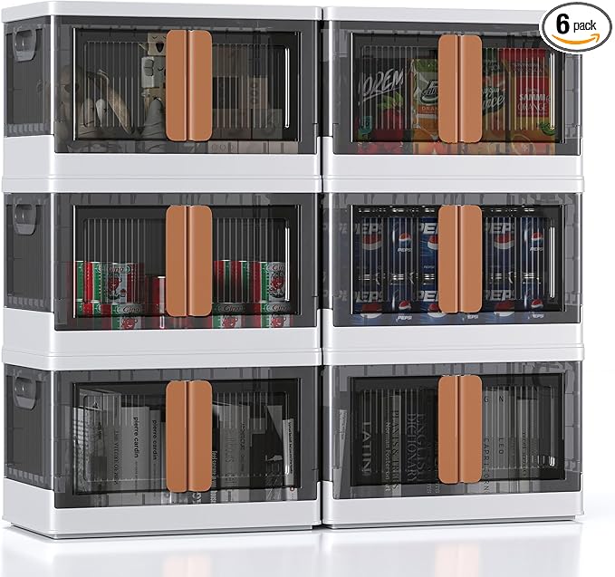 8.4Gal Collapsible Storage Bins with Lids & Wheels - 6 Pack Stackable with Doors, Heavy-Duty Plastic Containers for Home/Office, White