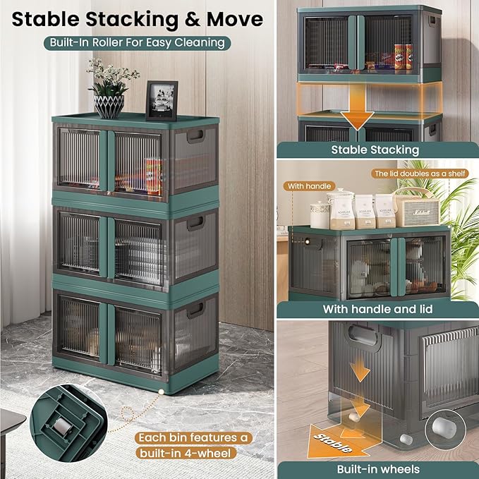 19Gal Collapsible Storage Bins with Lids & Wheels - 4 Pack Stackable with Doors, Heavy-Duty Plastic Containers for Home/Office, Green