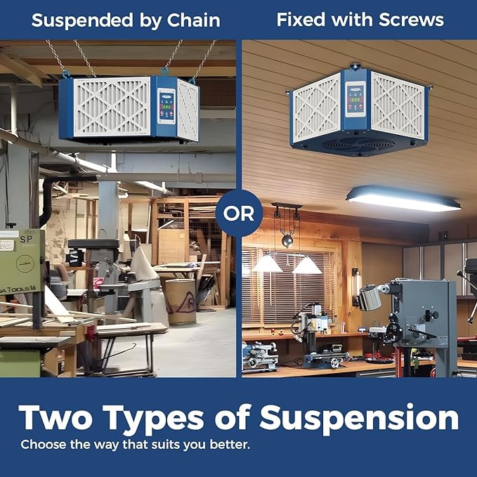 - Accessibility: Timer cycle controller, you can set fan to shut down automatically in 1-9 hours. √ IR remote system: There is no wireless interference, and the anti-interference ability is strong. √ With a hook and chain: Puricare 1350IG air filtration system is easy to move and can be hung from the ceiling in the shop or placed on a workbench.