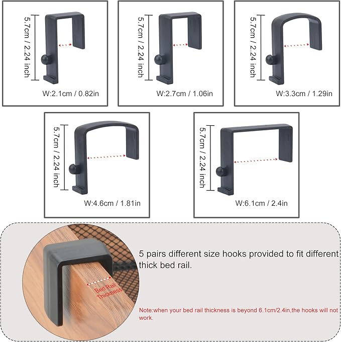 - Durable and Roomy Storage Basket : The basket is made of reinforced and high density iron wire mesh around with well welded strong iron wire,surface finished with glossy painting.Basket appro size:10.43"x4.72"x3.62"(LxWxH).5 pairs different size plastic hooks offered to fit different thick bed rails,Thickness of bed rail the hooks can fitted are:2.1cm/0.82",2.7cm/1.06",3.3cm/1.29",4.6cm/1.81",6.1cm/2.4".(Note:If the thickness of your bed rail is beyond 6.1cm/2.4",all the hooks won't work for it)