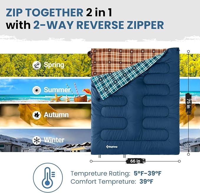 - MULTIFUNCTIONAL DESIGN-More Than Just a Sleeping Bag: This versatile sleeping bag offers more than just a place to sleep! The 2-way zippers allow you to zip two sleeping bags together for couples or family camping. Unzip the bottom for extra ventilation to cool your feet on warmer nights. Not only can it be used as a sleeping bag, but it can also be transformed into a blanket or picnic mat for family trips. Plus, it's machine washable, making cleaning a breeze for frequent use.