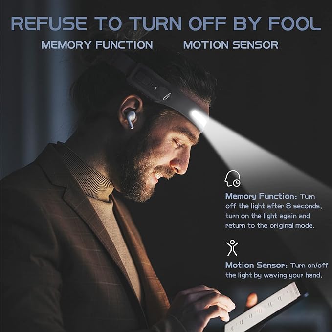- Memory Function and Motion Sensor: The head lamp automatically recalls the previous brightness level and can be turned off after 8 seconds of use; It also features a motion sensor for easy operation; Just activate the sensing switch and wave your hand