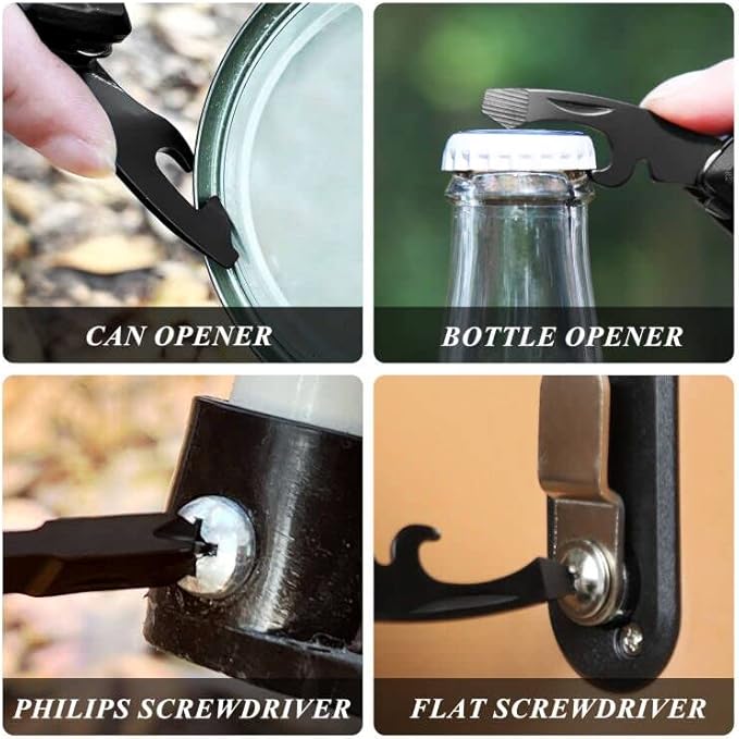 - All-in-One Multitool Knife: Features 15 essential tools, including a knife, 5-Size Wire Stripper, Wire Cutter, 9 screwdrivers, Bottle and Can Opener—designed to handle camping, hiking, DIY, eletrician work and everyday tasks with ease.