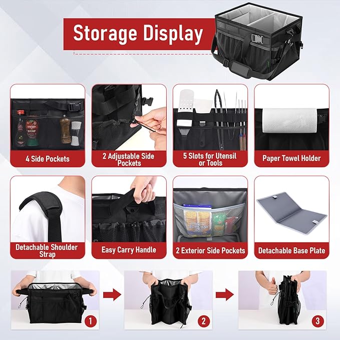 - Easy Carry & Versatile- Features with a detachable padded shoulder strap and easy carry handle for your convenience, make carrying stuff in and out to outdoor activities much easier, saves your time repeated between grill and your kitchen, a great table tool caddy for grilling, picnic, patio, camping, barbecue, outdoor dinner, griddle, rv, also an great gift for grilling lover and camper