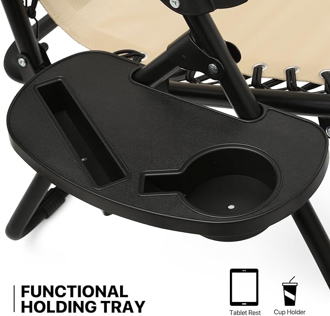 - Detachable Tray - These zero gravity chairs are equipped with durable plastic accessory tray providing perfect place to set drinks, magazines, phones/tablet's, or other small items for convenient accessibility. And the zero gravity patio lounge chairs set, includes 2 chairs and 1 folding table, suitable for holding drinks and more food during your leisure time.