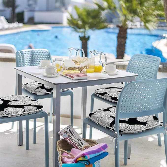 Indoor/Outdoor Chair Cushions 16x17 Inch, Patio Chair Cushions with Ties, All Weather Seat Cushions for Patio Furniture Home Garden Chair Use, Set of 4, Black Lush Leaves