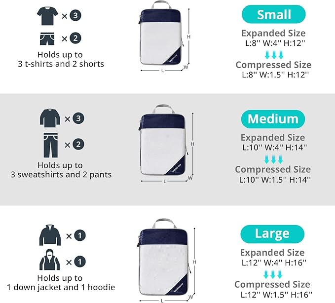 - Organize Like a Pro: These 7-set travel packing organizers contain 3 compressible cubes and different travel organizers for small items. Keep your clothes and accessories separate and avoid the hassle of rummaging through a messy suitcase
