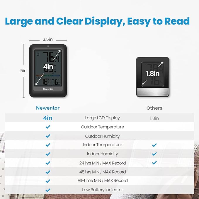Newentor Indoor Outdoor Thermometer Wireless, Weather Stations Wireless Indoor Outdoor, Outdoor Thermometers for Patio House, Black with 1 Sensor