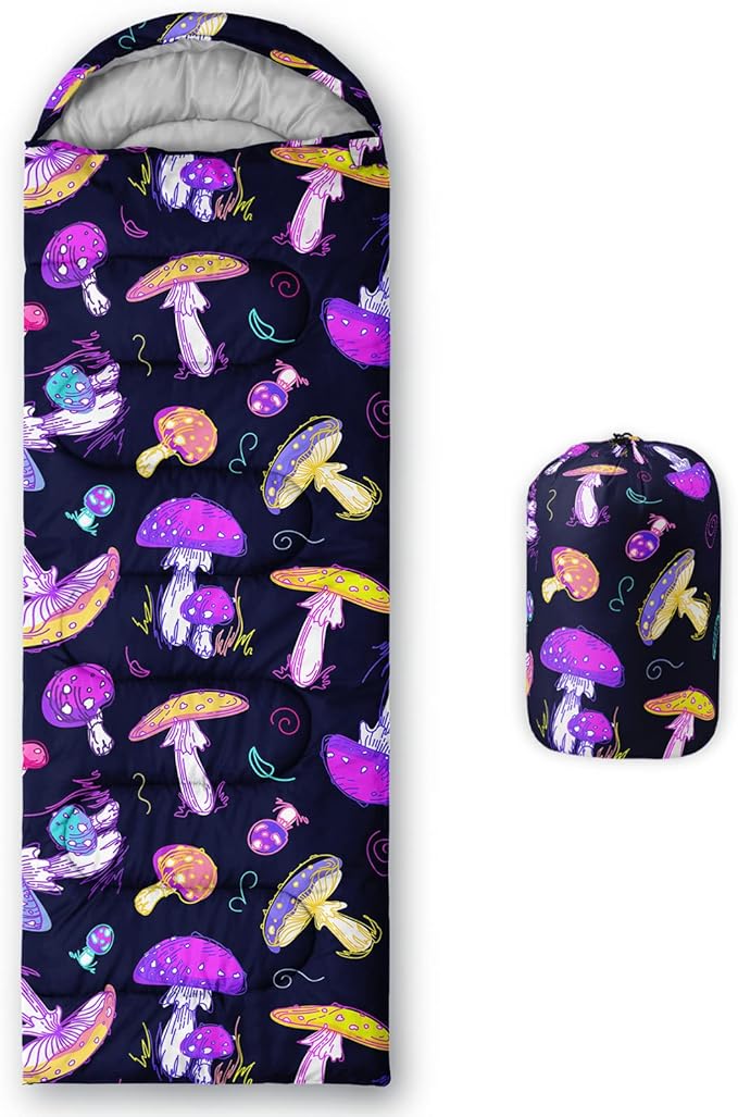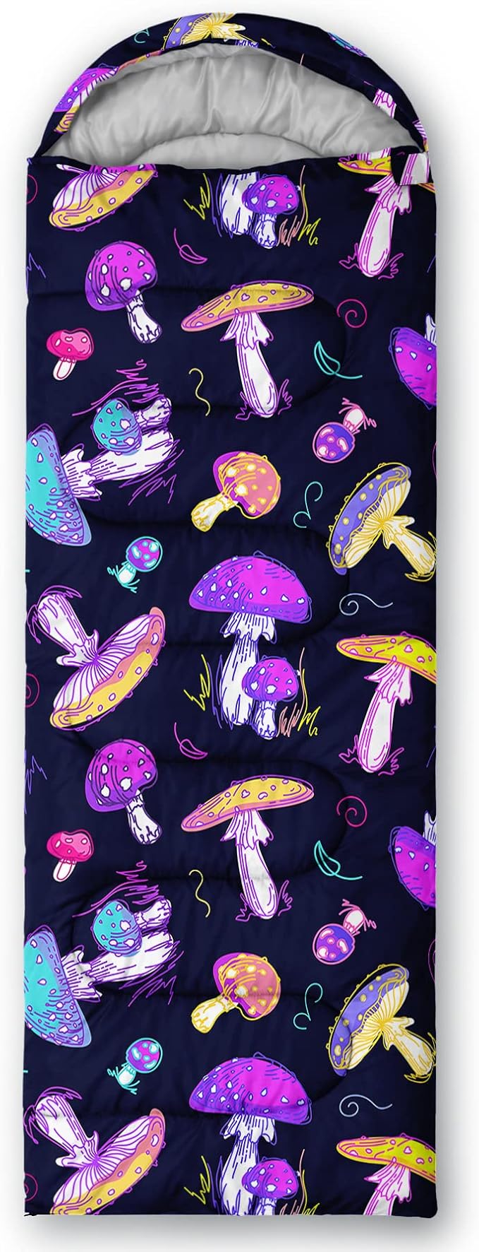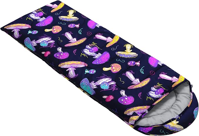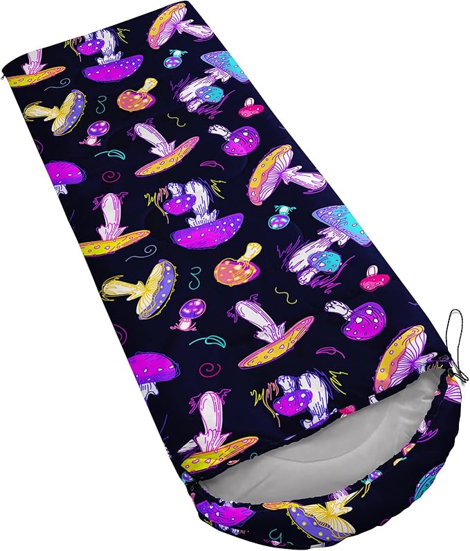 - A THOUGHT OUT DESIGN: Drawstring allows you to tighten hood and keep you warm. The idea of having a zipper at the foot to allow more warm or cool air to enter or exit the bag in different times of the season.Our Purple Mushroom sleeping bags are designed to provide much needed rest after a full day of outdoor activities.