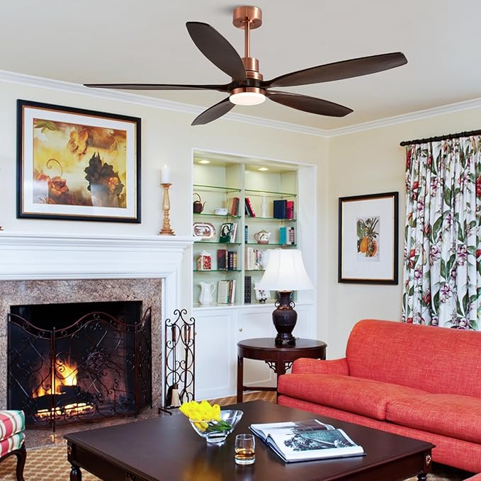 60" Ceiling Fan with Light and Remote,Reversible DC Motor,6Speed,Modern Natural Wood Ceiling Fan with Dimmable LED for Outdoor Patios Bedroom Living Room,Black Walnut and Red Brass