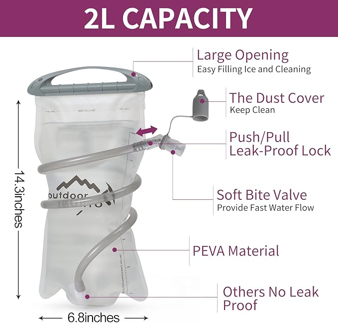 • 🚴‍【Premium Quality Water Bladder】The Hydration Pack Backpack comes with a 2 liter hydration water bladder and two 250ml soft flask. A switch valve and a cover cap make double leak-proof. Large opening allows quick filling of water and ice and it is easy to clean, the water line (40"length,0.4"diameter) provides a wholesome flow for easy drinking keeps your water tasting fresh, all day. The water temperature is range -20~+50℃.
