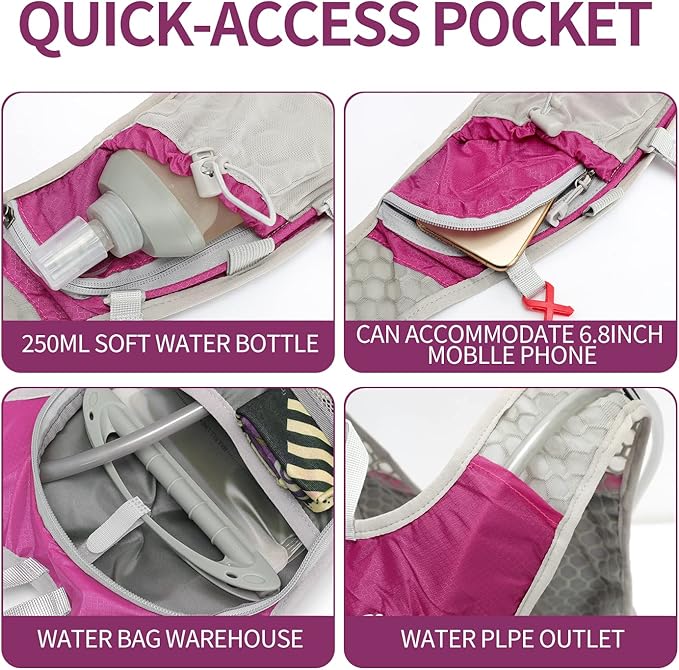 • 🚴‍【Security and Multiple Storage Pocket】Water backpack for hiking Reflective trim for night safety, has multiple pockets can store various necessities outdoor. The bottom front pocket allows you to quickly find what you need during hiking. Smaller quick access items without removing the pack, such as keys, wallet, gadget, sunscreen, phone, towel, or any other items. To travel light, efficient access, let you run faster and farther.