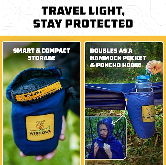 - Smart Storage Design – Built-in pouch holds small essentials while in hammock mode, and transforms into a rain poncho hood. No loose pieces to lose, and no added bulk.