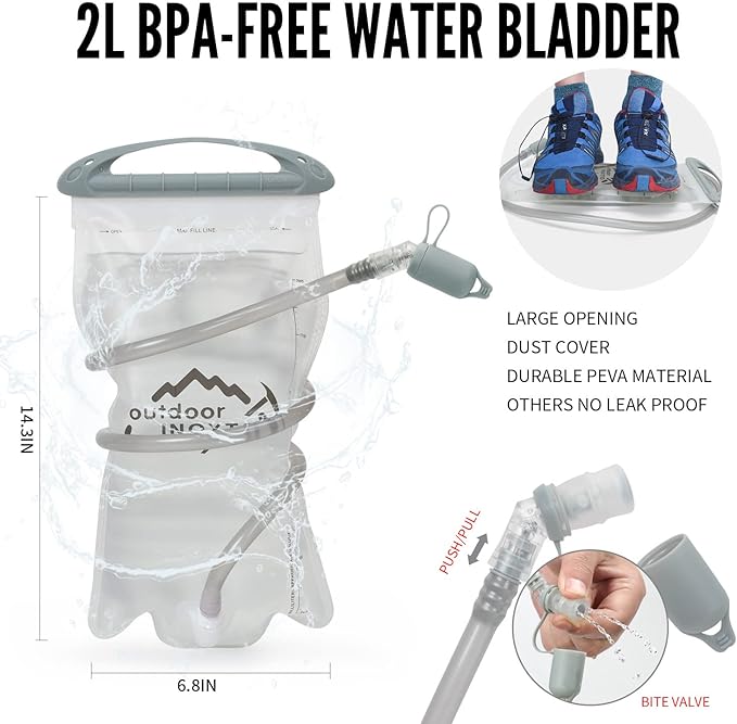 - đ´âăPremium Quality Water BladderăThe Hydration Pack Backpack comes with a 2 liter hydration water bladder and two 250ml soft flask. A switch valve and a cover cap make double leak-proof. Large opening allows quick filling of water and ice and it is easy to clean, the water line (40"length,0.4"diameter) provides a wholesome flow for easy drinking keeps your water tasting fresh, all day. The water temperature is range -20~+50â.