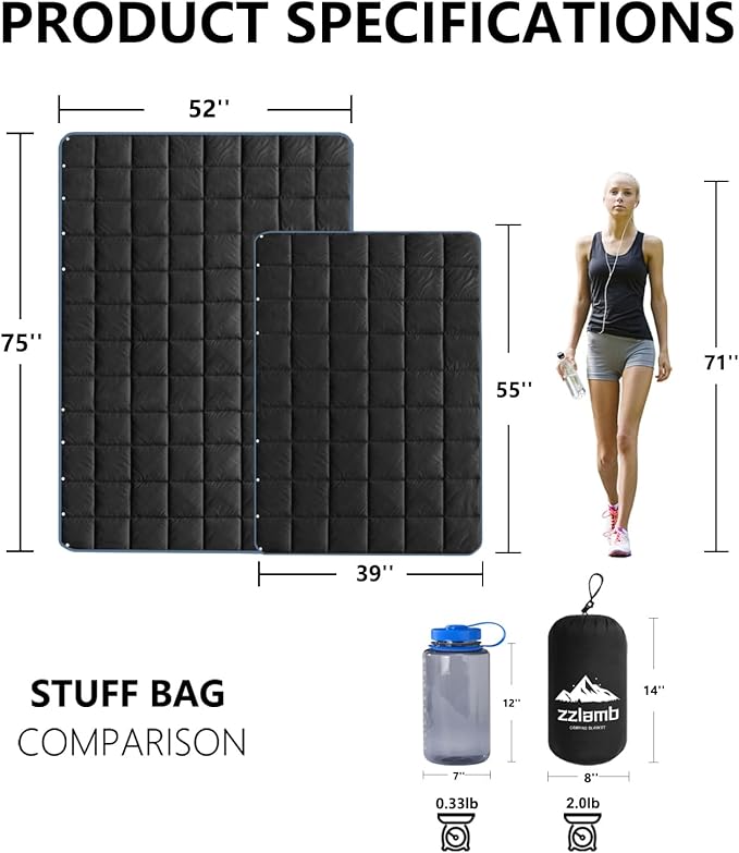 - Measurements: The puffy camping blanket for adults measures 52” x 75” when laid flat and 7” x 14” when packed. For adults, please choose 52’’x75’’. If adults or big-boned kids bought the size of 35’’x59’’, it might be a little bit small. Filled with 100% recyclable materials, the weight of the blanket is only 1.54 lbs. It is both warm and comfortable