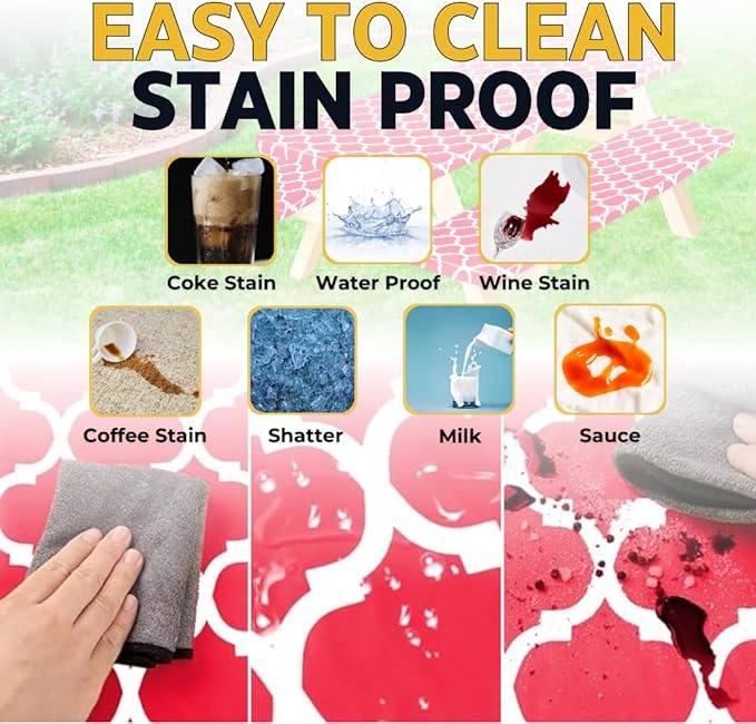 - No more dirty tables & benches, No more splinters & messy accidents when the wind blows. Elastic corners and soft flannel backing will keep the picnic table cloths securely snug and tight fit in place without CLIPS