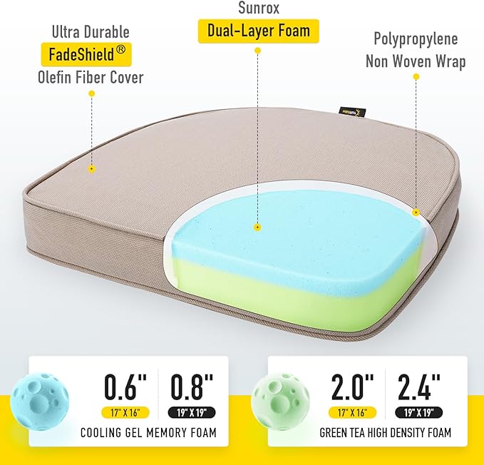 SUNROX Gel Memory Foam Chair Cushions, FadeShield Water-, Stain-Resistant Durable Reversible Seat Cushion Pads with Ties for Indoor/Outdoor Kitchen Dining Office, 19"x19", Set of 4, Husk Birch